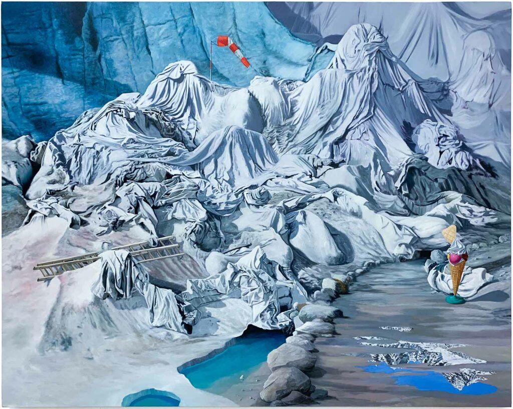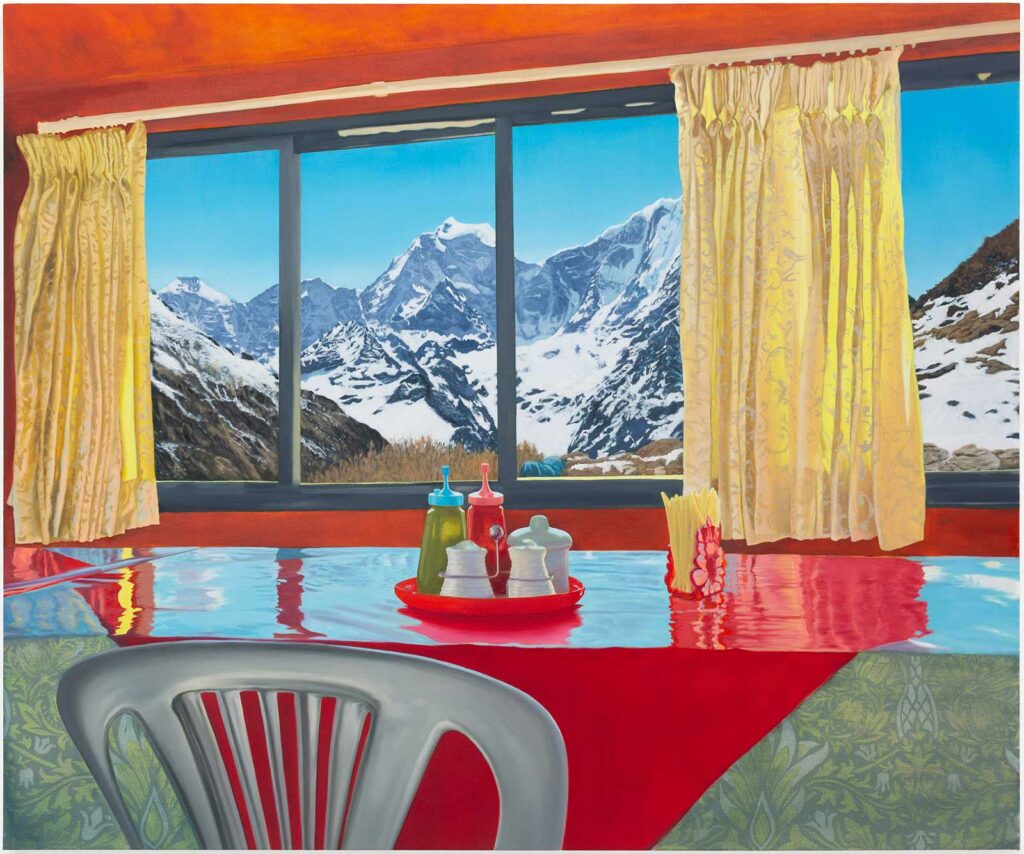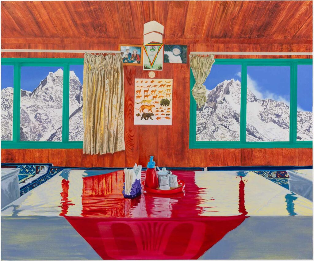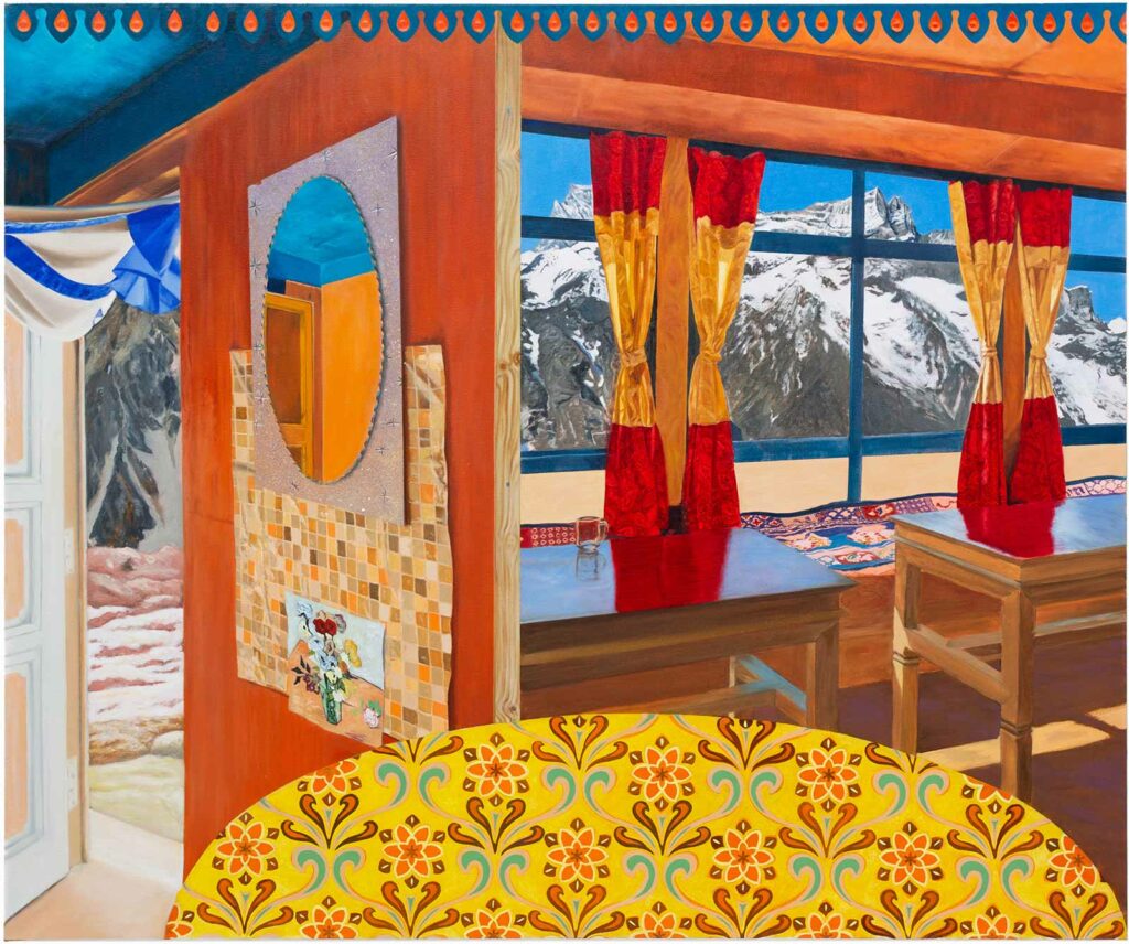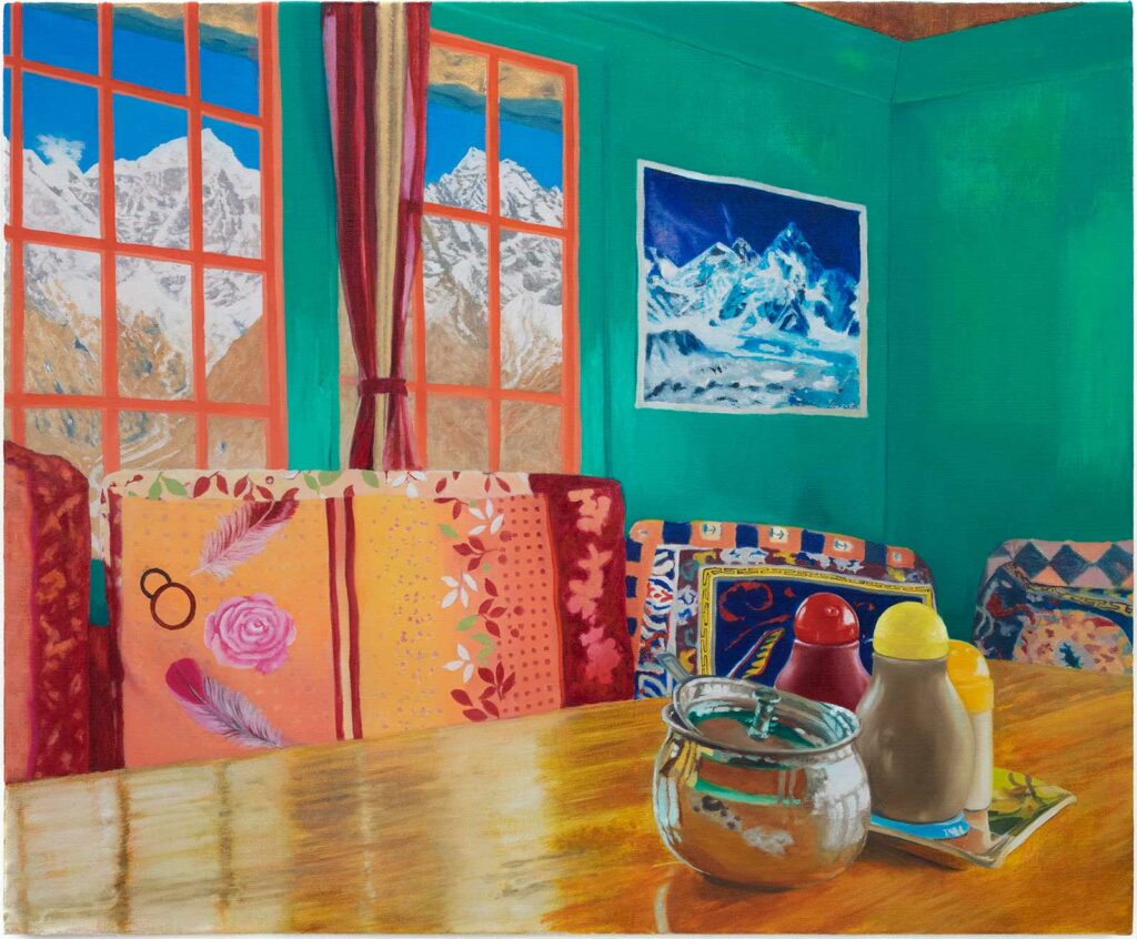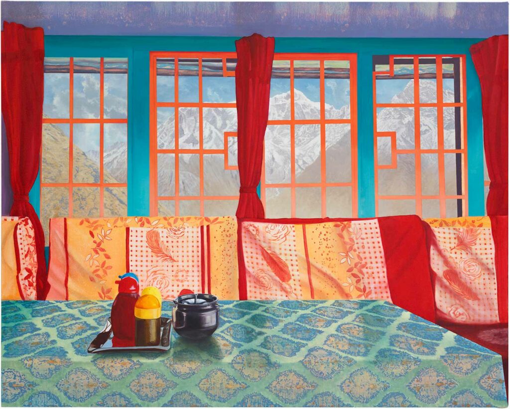 My recent body of work is largely represented by paintings of modest interiors looking out at Himalayan mountains-capes. These works continue my enduring interest in landscape and mountains as subjects in art but which increasingly use windows and interior space to explore spatial possibilities in painting. By including the mountains as a constant presence they begin to function in the way in which iconography does in many cultures, itself a reference to the sacred role that Mountains play in many Asian cultures. I’m interested in the ways in which people relate to landscapes culturally and the role that painting has played in forming these relationships. By including the everyday-looking domestic objects placed before the spectacular backdrop of the mountains I intend to upend the Romantic archetypes often attributed to mountain scenery.