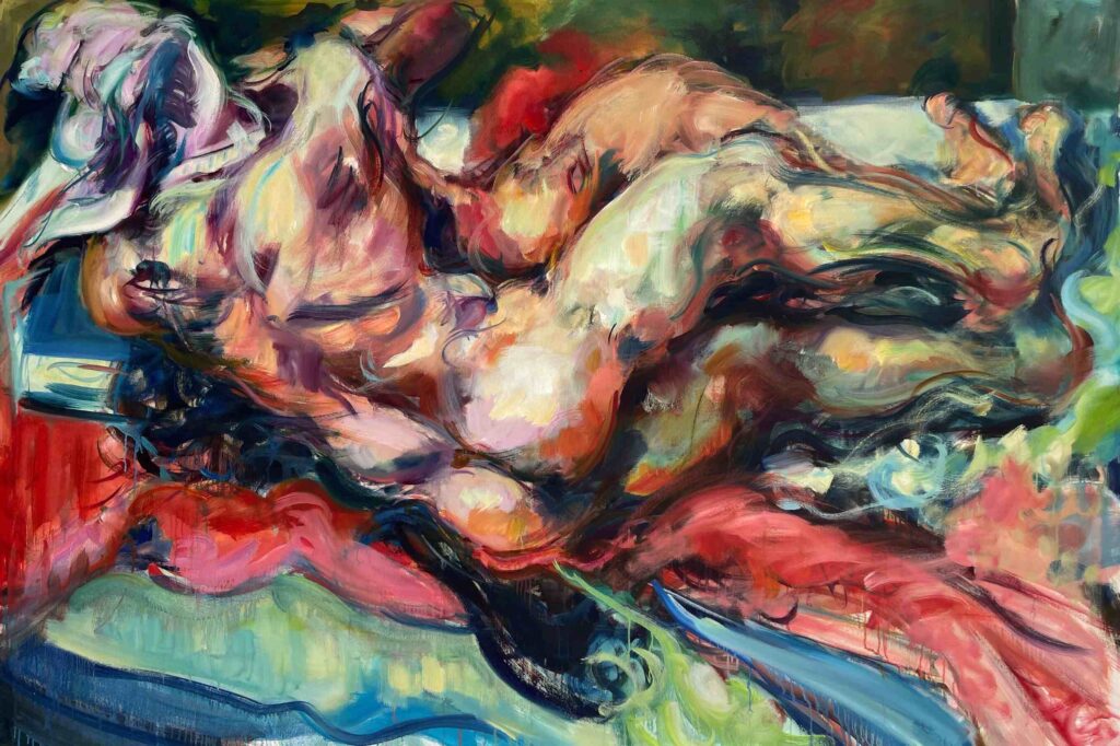 The arenas in which the paintings take place range from the bedroom and the act of making love, to a lip synch from Ru Paul’s Drag Race France, and on to a family outing to Singapore Zoo or the act of caring for a frail parent. Through touch, physical gesture, colour and paint’s materiality, the works explore ideas of intimacy and the performative fantasies and power dynamics that are revealed in our love making; a sudden and unexpected moment of empathy and queer solidarity expressed between two players on a competition stage; and feelings of familial ease, affection, care and togetherness, seen through the retrospective, sometimes yearning lens of loss.