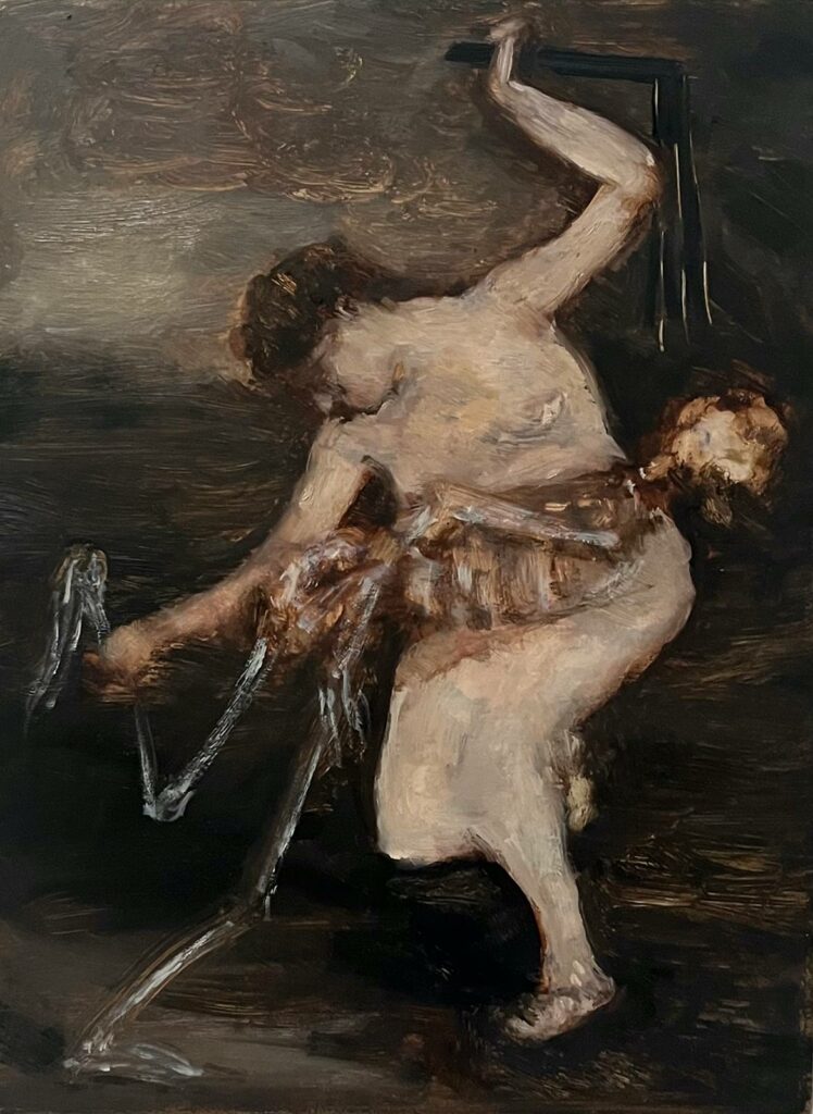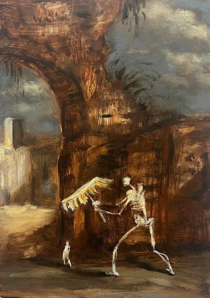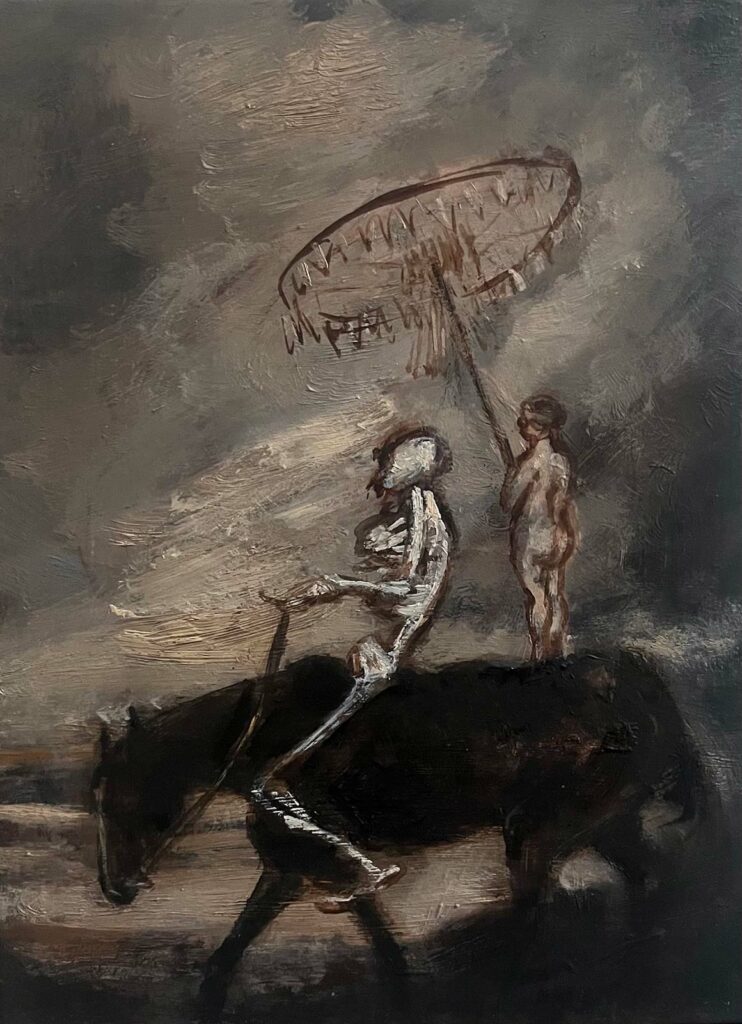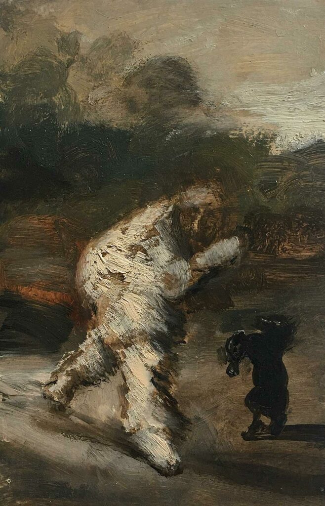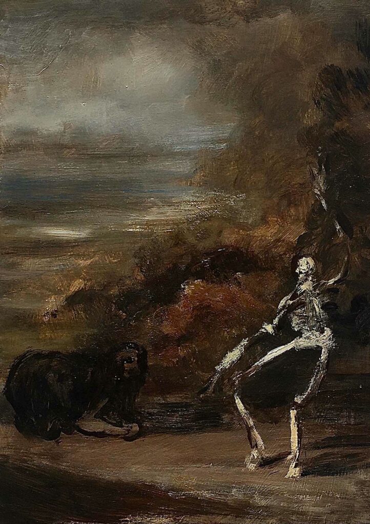 Lisa Ivory’s landscapes are commonly occupied by a Wildman, who occasionally interacts with a female human figure. There is a Rake’s Progress of sorts, with a skeletal Death figure interrupting the discourse between these characters. The Beast attempts sympathetic magic by scrawling images into the landscape. These exchanges occur in a shadowland — a liminal space of a half-forgotten place that exists simultaneously as rural, urban and wasteland populated with anomalies, chimeras and spectres.