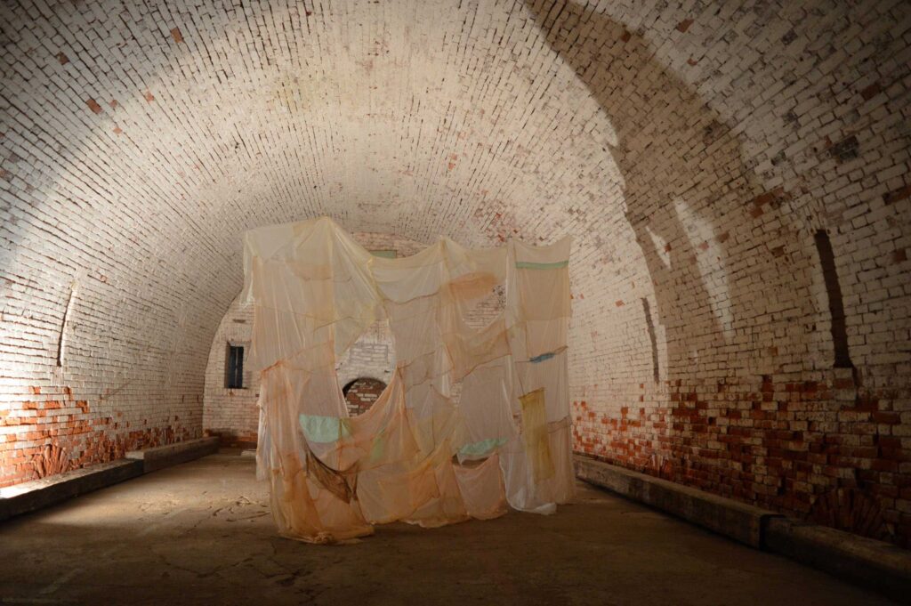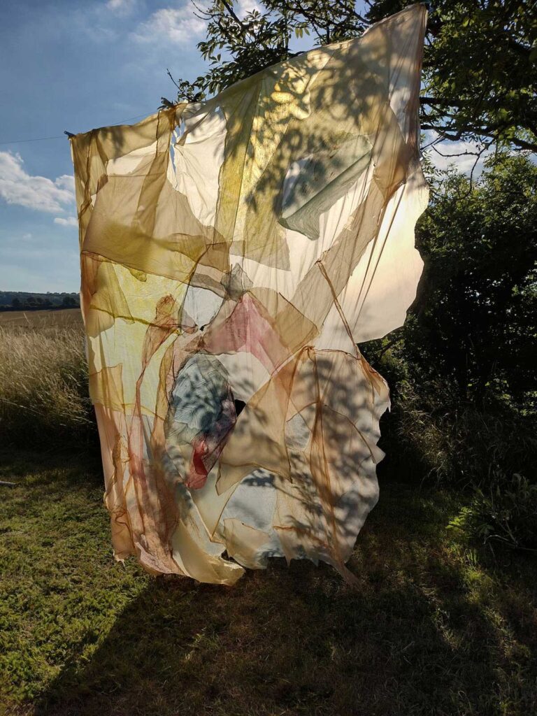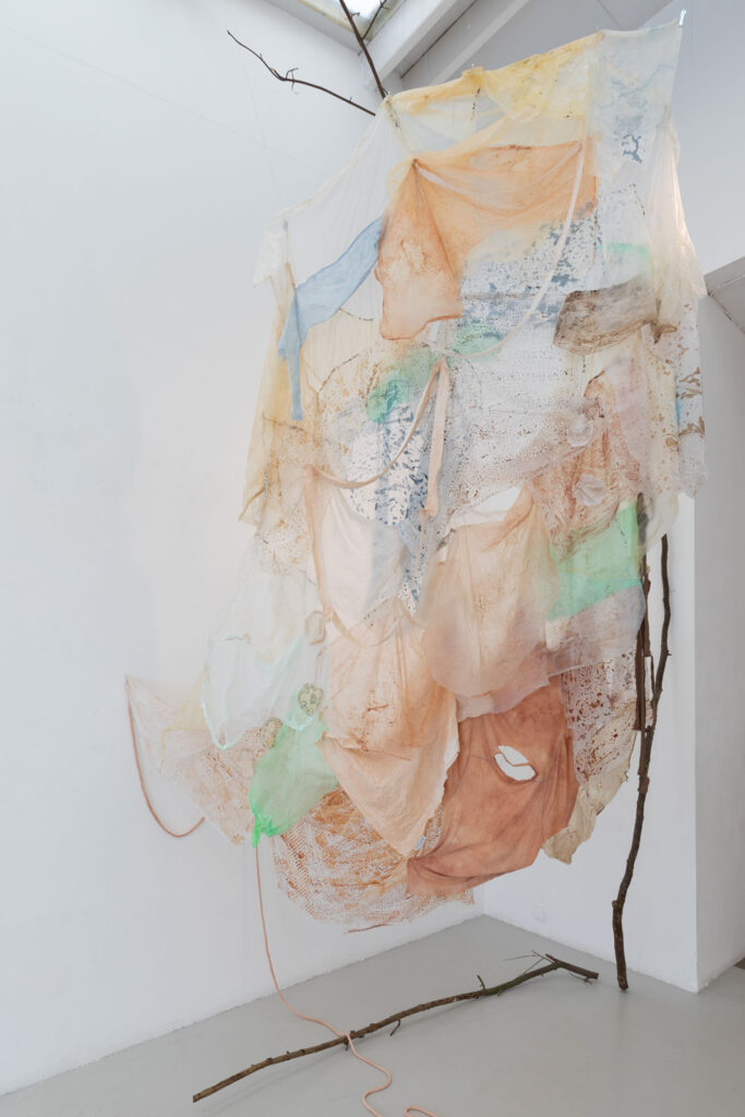 materials such as bioplastic grounds which are loosely sewn together with silk, coloured with