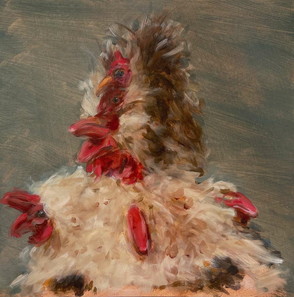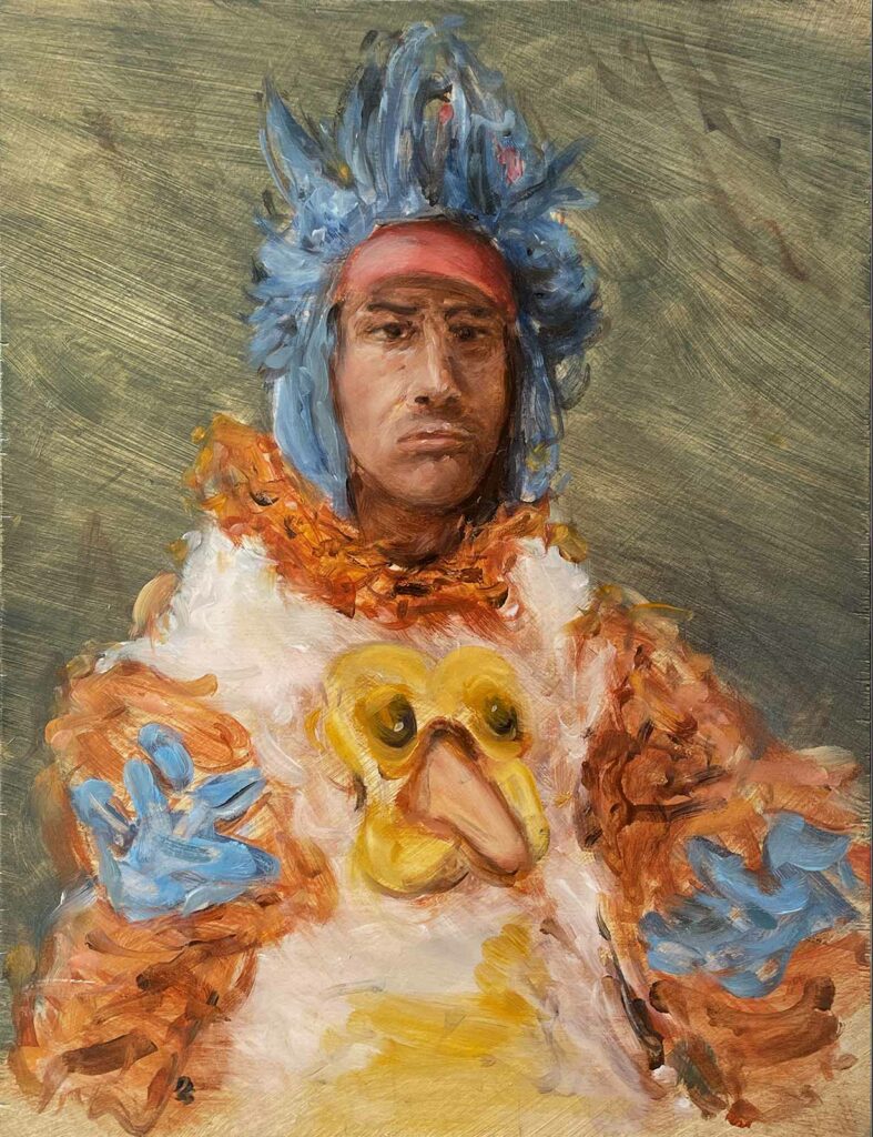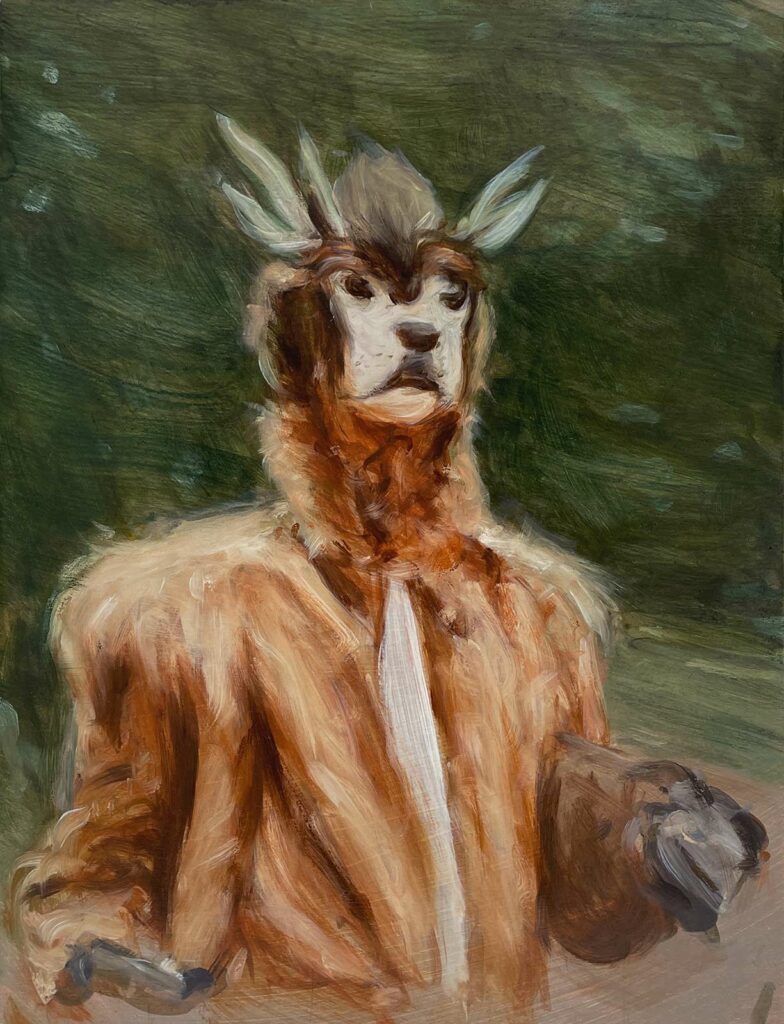 Rich Jellyman makes paintings that reference internet culture and incorporate technology in the selection of subject matter. Utilising images that display a certain kind of internet sensibility – disposable phone photos, surreal mashups taken from Reddit threads, bad photoshop, memes, AI and video game glitches. His most recent series of paintings are anthropomorphic portraits that use AI image generation software to appropriate likenesses.