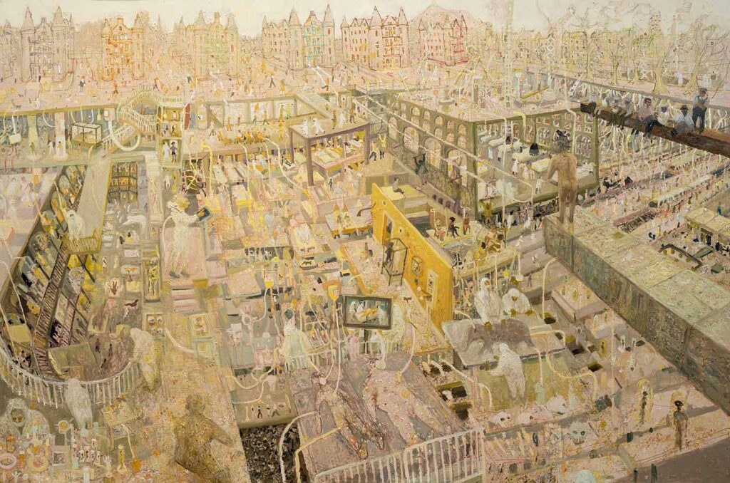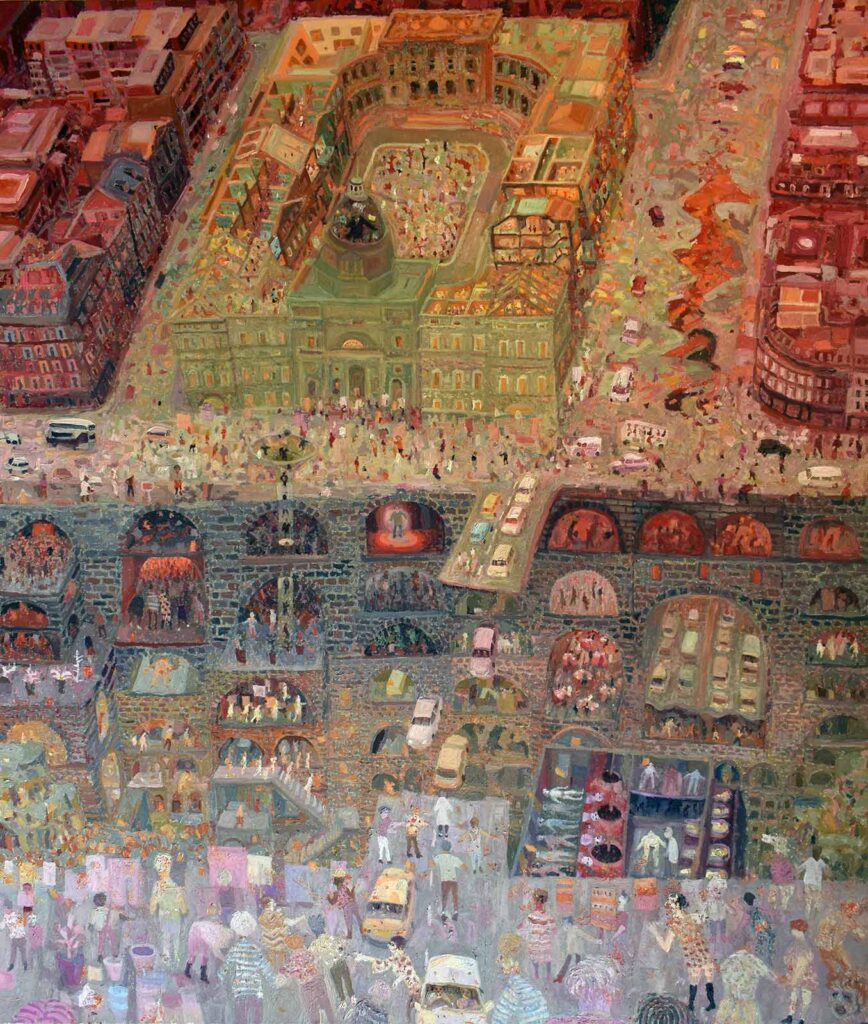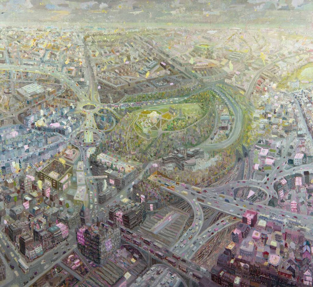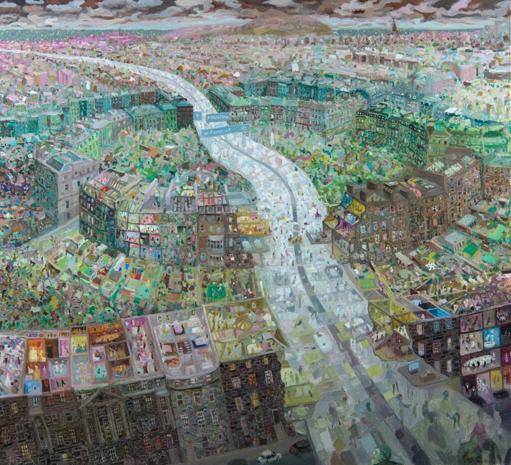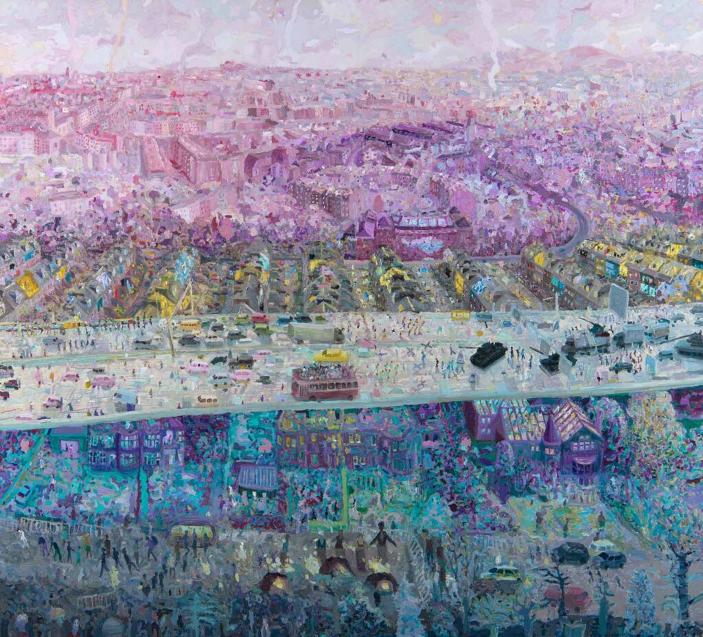 I reimagine places and invent narrative scenarios within a cinematic context, often celebrating the tropes found in science fiction film and TV. I paint from memory, deduction and invention embracing the physical act, helping me recall half-forgotten events and imagery. My early work focused on domesticity and modern family life. I grew up watching epic cinematic films, such as “Ben Hur” and “2001 a Space Odyssey”, informing the epic panoramas I create in my work. I try to recreate known locations from improvised associated memories using pictorial cutaways and dolls house devices allowing multiple events and timelines to co-exist within the same picture.