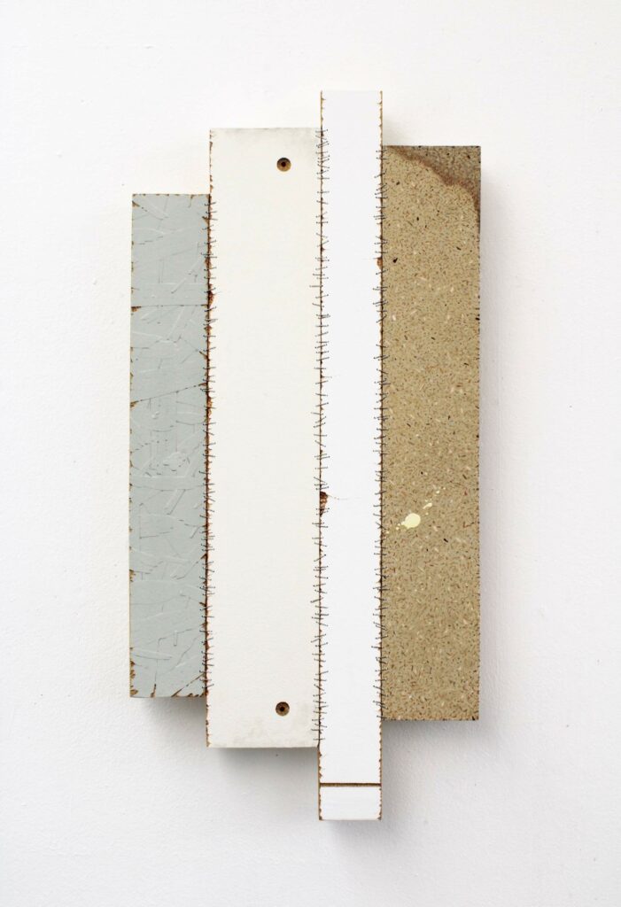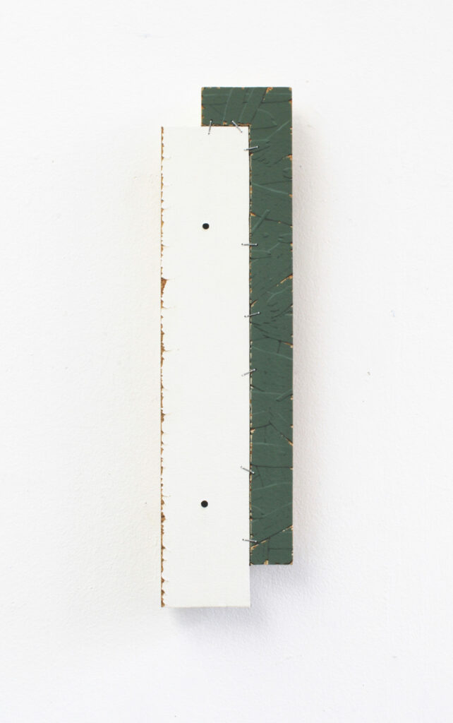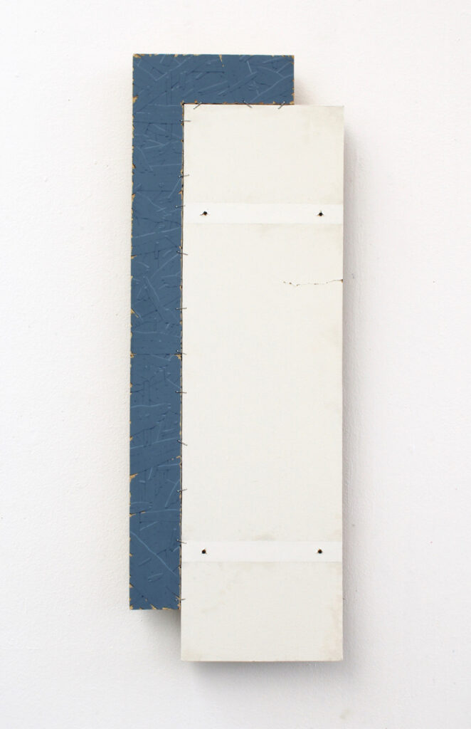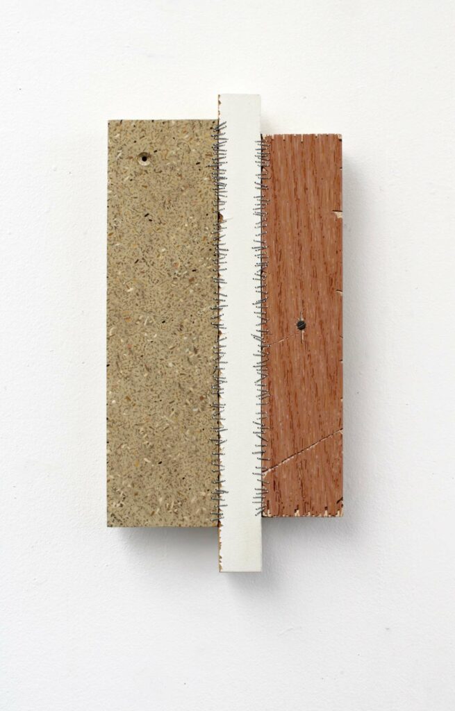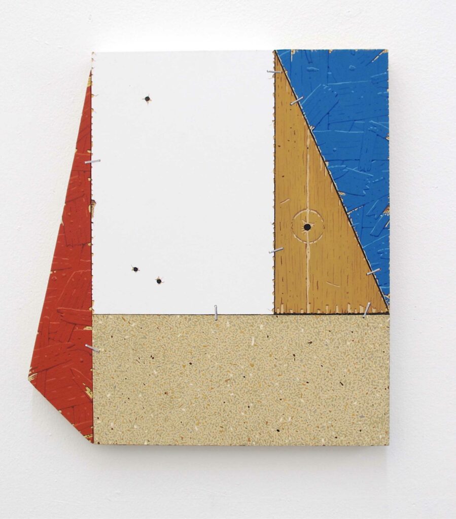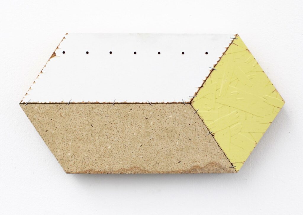 Roland Hicks makes paradoxical paintings and objects that look like minimal abstract assemblages – apparently slightly crudely stapled together from offcuts of various types of chipboard. Sometimes these pieces also create a simple illusion of a three dimensional geometric solid, or of one form sitting in front of a shadow form behind it. Less simply, all the joins, staples, different chipboard textures, roughly sawn edges etc are actually meticulously painted by hand – so, in addition to its abstract properties, his work is equally concerned with ‘trompe l’oeil’ still life painting.
