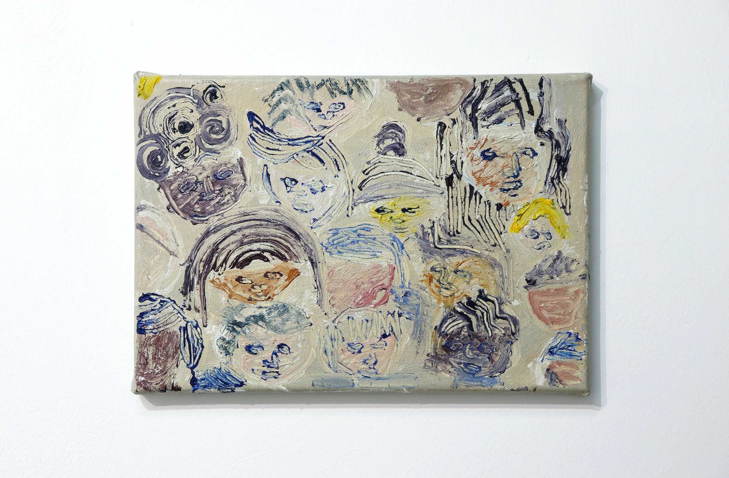 ‘Stand Close and Breathe Me In’ presents twenty two paintings no bigger than 30cm on the longest side, each by a different artist and brought together by Enzo Marra, artist and curator, in association with Contemporary British Painting. Is the only reason these paintings have been brought together because of their stature? It’s up to the viewer to work out what holds this gathering together. Like walking into a party and not knowing who anyone is, it’s an unnerving experience. These paintings are looking at you and waiting…blinking even.